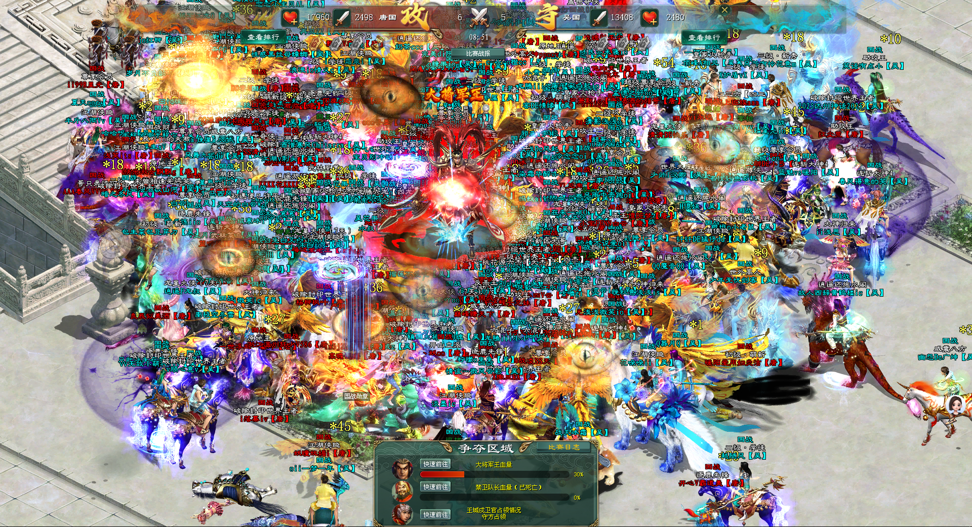 当国战号角吹响后,所有吴国参战的将士们以空降的方式到达位于唐国王城的禁卫队长处。当吴国将士落地后,所有人手中的武器牢牢锁定在了禁卫队长的身上,不停地施放着技能与大招。