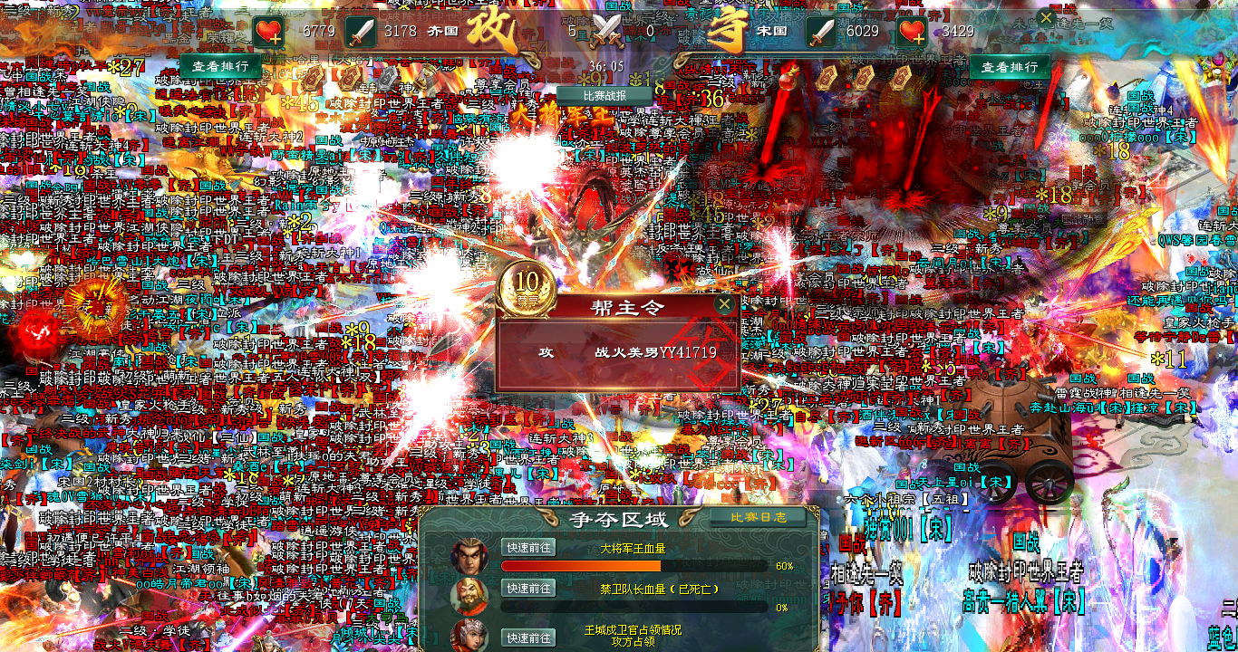 眼看大将血量岌岌可危,齐军指挥孤注一掷,拉出帮主令,最后的大军倾巢而出,与宋军展开最后的激战。此时的战场上,早已杀的昏天暗地,双方将士都杀红了眼,只是不管不顾的向着既定的目标攻击,再攻击。倒计时的钟声在耳边敲响,宋军将士咬紧牙关,发起最后冲锋。当大将血量清零的刹那,弹出的系统公告显示,宋国胜利!