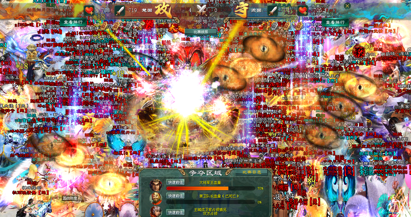 金钟破碎的刹那,楚军主力旋即回师大将,攻势愈发狂暴。燕国大将血条以惊人速度下降,当血量跌至30%时,楚国指挥再度拉出国王令,发起总攻的号角。楚国将士士气如虹,攻势凛冽直冲大将。燕国也接连拉出家族令发起支援,可零星的援军在楚军进攻的洪流面前,显得那么不堪一击。