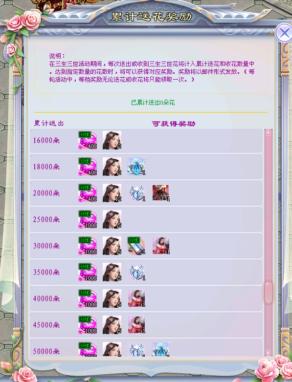 通过累计收/送花,可得史诗·定情信物自选、三生三世·变身自选!