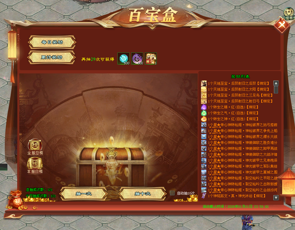 转生神装百宝盒上线,累计抽取指定次数,必得转生神装锻钢自选!