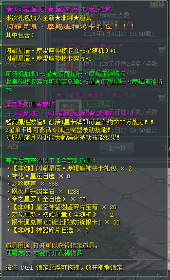 圣诞献礼,专为突破而来!圆满战力包内可得圣诞限定必兑核心,可兑龙吟星【雷电火】9星、龙吟星石碑【雷电火随机】九槽,搭配海量帝心·仙缘强化丹和帝王精炼原石,助你战力圆满进阶,决胜年末巅峰战场!