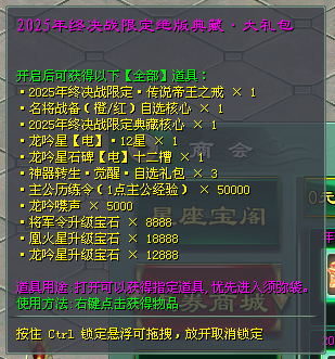 2025年终决战限定绝版典藏·大礼包,使用可获得2025年终决战限定·传说帝王之戒、名将战备(橙/红)自选核心、龙吟星【电】12星、龙吟星石碑【电】十二槽等好礼!