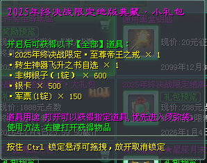 2025年终决战限定绝版典藏·小礼包,使用可获得2025年终决战限定·至尊帝王之戒、转生神器飞升之书自选!