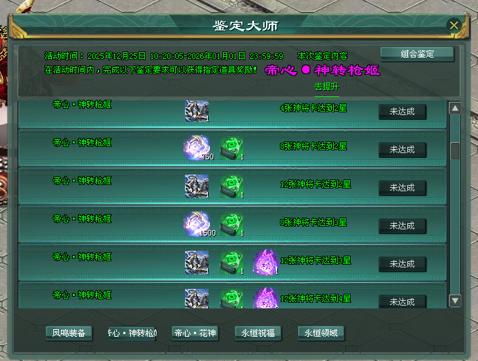 百宝盒内同时可得高星帝心神转枪姬卡牌,达成鉴定要求,可得转生神装·化神之证II,获大量神威、神装觉醒点数加成!
