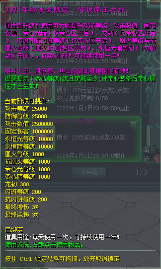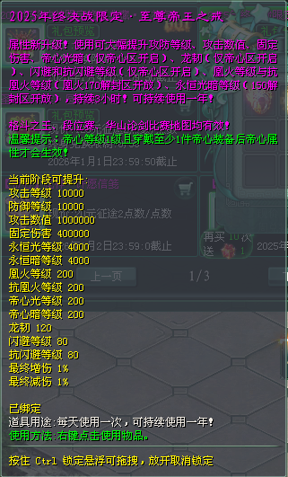 2025年终决战限定·至尊帝王之戒,使用可获得帝心光/暗等级、龙韧、闪避/抗闪避、百分比增/减伤效果,每天用1次,持续用1年!