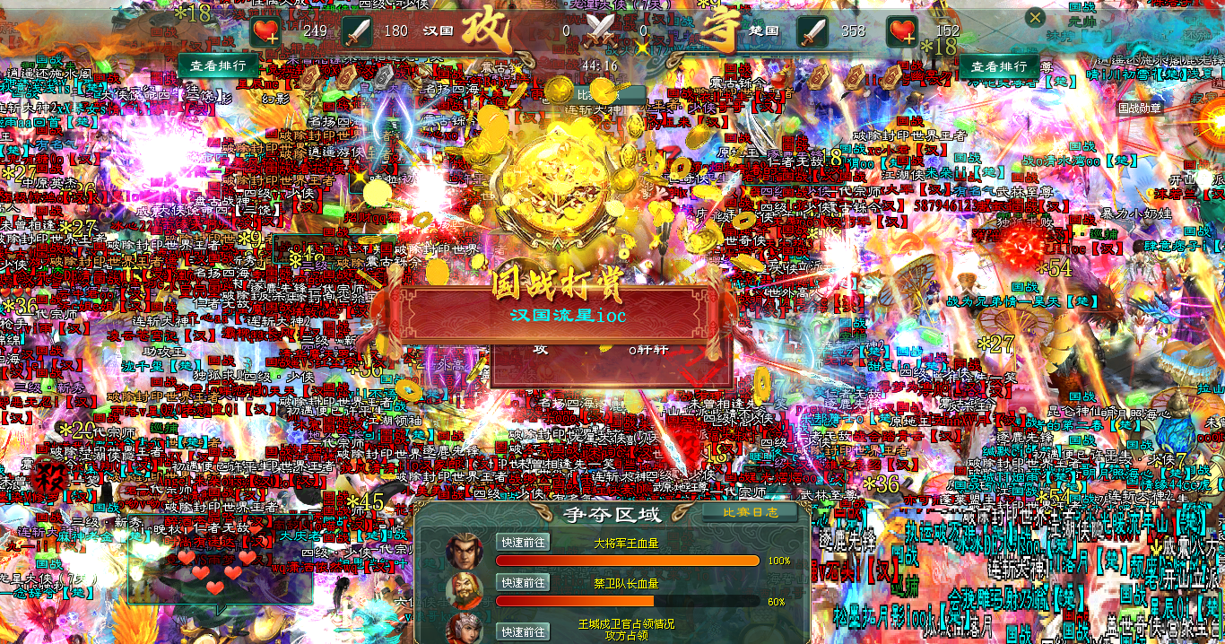 但这并未打乱汉国的节奏。在击碎第二道金钟的瞬间,汉国指挥发出了总攻的最终指令。所有的帮主令与最后的国王令在同一时刻尽数绽放,所有还能战斗的汉国将士,均被集结至大将脚下。那一刻,技能的光辉淹没了大将,仿佛天崩地裂。楚国最后的防御在这汇聚了汉国全部战力的终极一击面前,被彻底洞穿。