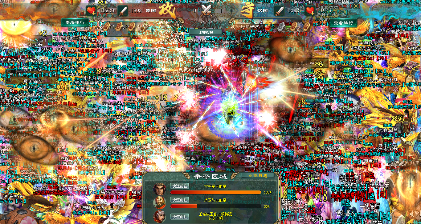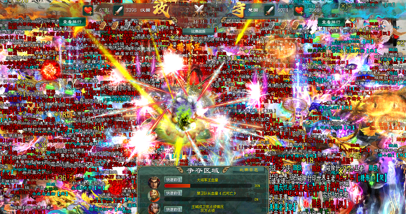20:15分,国战号角吹响,汉国的总攻如同出闸猛虎,全国精锐力量瞬间完成集结。这不是试探,而是重拳出击。第一波汇聚了全区顶尖火力的技能海啸般袭来,几乎在同一时间砸向小将。法师与战士的混合技能闪耀全屏,造成了毁灭性的打击,小将的血条自战斗伊始便进入了稳定而迅速的下降趋势。