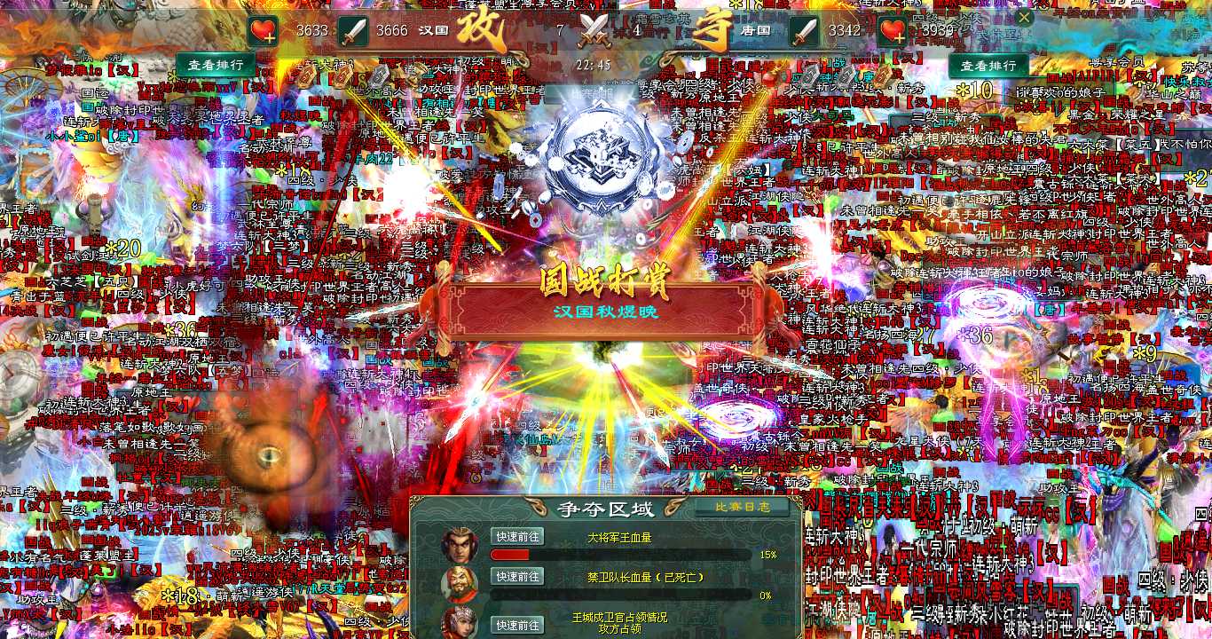 12月30日,在《征途2》年终决战区国战联赛第八轮中,汉唐两国相遇。汉强唐弱,实力相差悬殊,这是战前所有人心照不宣的事实。这场国战,在多数人眼中本该是汉国铁骑如秋风扫落叶般踏平唐国,却没人料到,看似孱弱的唐国,竟在生死关头布下了一步扭转乾坤的险棋,让这场本该迅速一边倒的战役,延长了10多分钟。