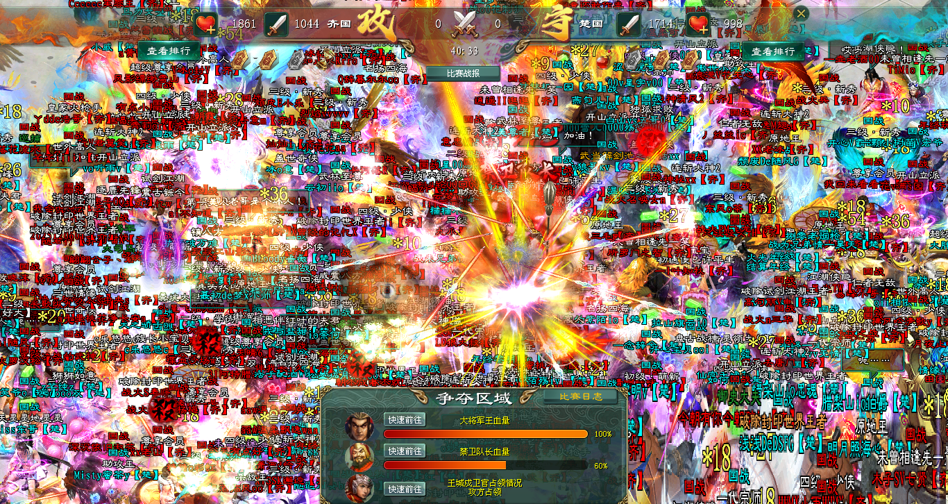 随着国战结束时间的接近,楚国毫不犹豫的选择了加时。楚军的进攻带着破釜沉舟的决绝,没有任何犹豫。忽略时间,忽略一切。他们只把所有技能、所有怒火,砸到大将身上!集结令,家族令,都拉了起来!预备跟齐军拼到最后一秒!楚国的兵力被再次凝聚,发起了近乎自杀式的集体冲锋。这孤注一掷的猛攻竟真的撼动了齐国的防线,在加时赛中艰难地啃下了大将剩余的血量。