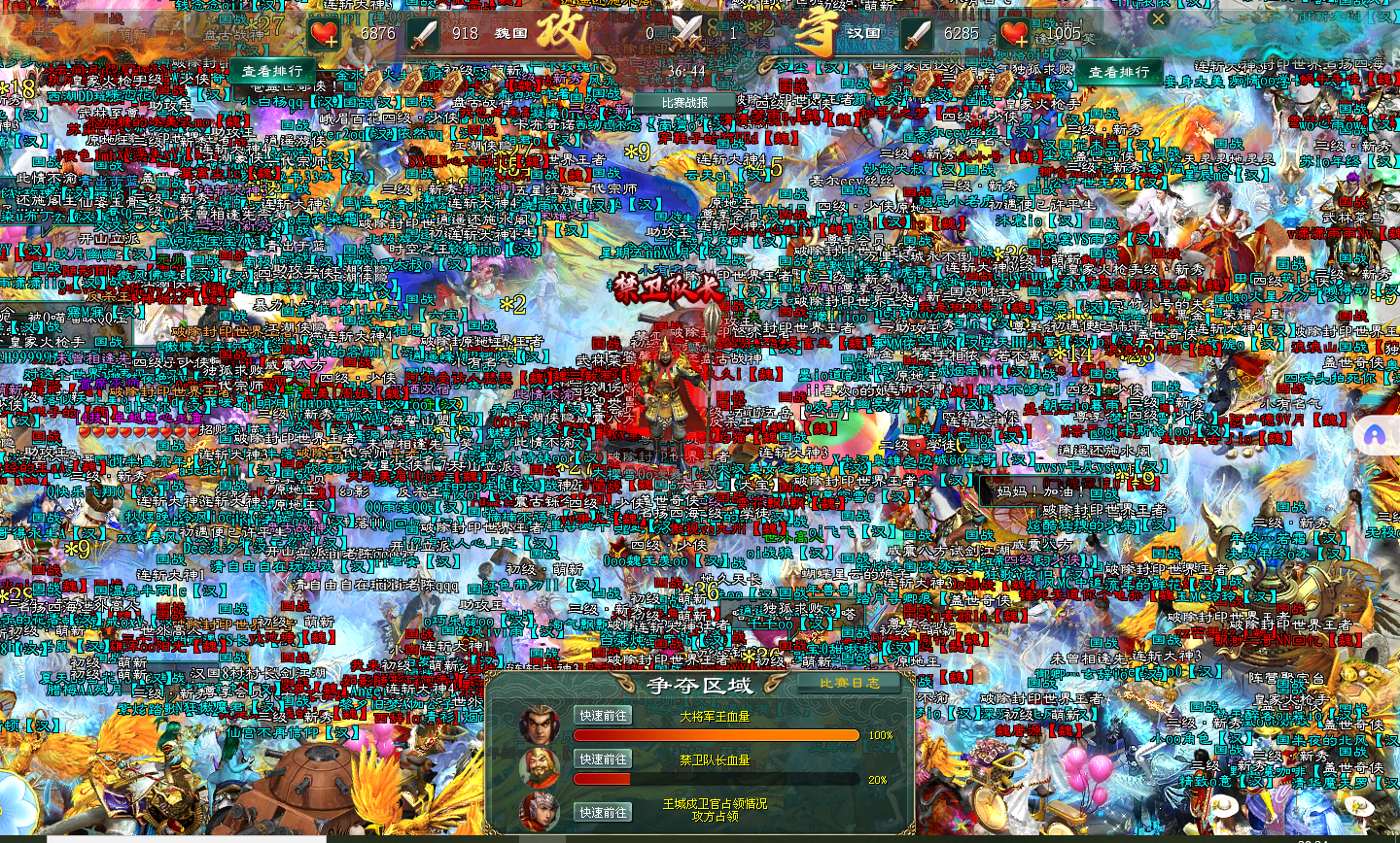 禁卫队长的血量条下降的速度和魏国战士连绵不断的大招同时进行,魏国战士进攻的速度不减,魏国战士在分出精力对抗防守方汉国压力的同时,无限输出禁卫队长,禁卫队长在国战开始不到半个小时里就已经濒临死亡。