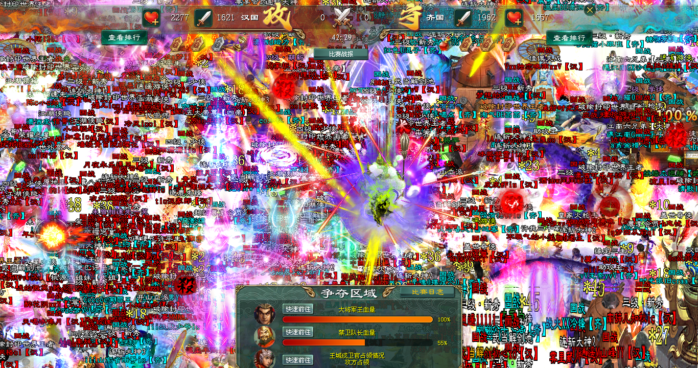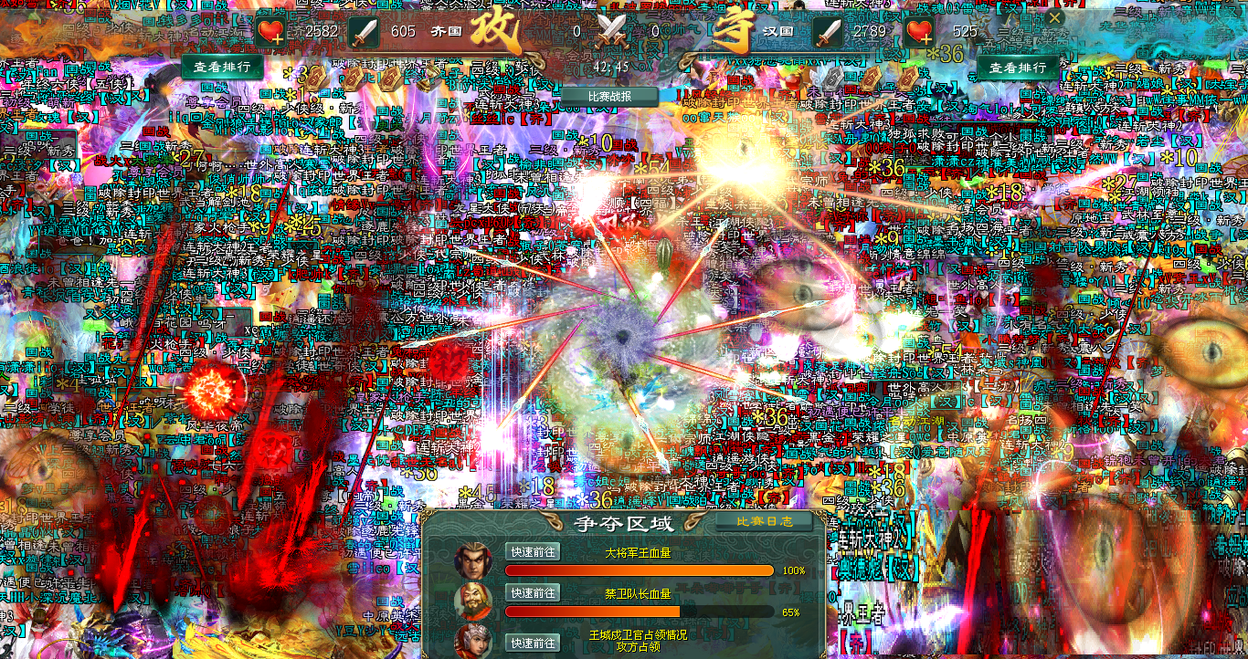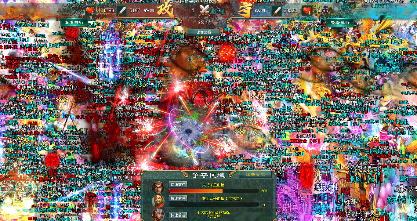 此刻,齐国开始打赏,丰厚的银子被激励给所有参与进攻的将士们。重赏之下,齐国的攻势犹如滴水浇油,变得愈发狂猛暴烈。大将的血量在一开始就下降得飞快,战士的刀光与法师的火术几乎将其淹没。仅仅十分钟左右,大将血量已然暴跌至一半!如此危急关头,汉国迅速为大将回血,将其血量瞬间拉回10%。同时,大批汉国精锐接到大将的求救令,从各个角落传送而至,全力绞杀齐国将士。这样一套组合拳打出来效果显著,齐国凶猛的攻势首次被有效遏制,输出节奏中断,不得不暂时后退重整。