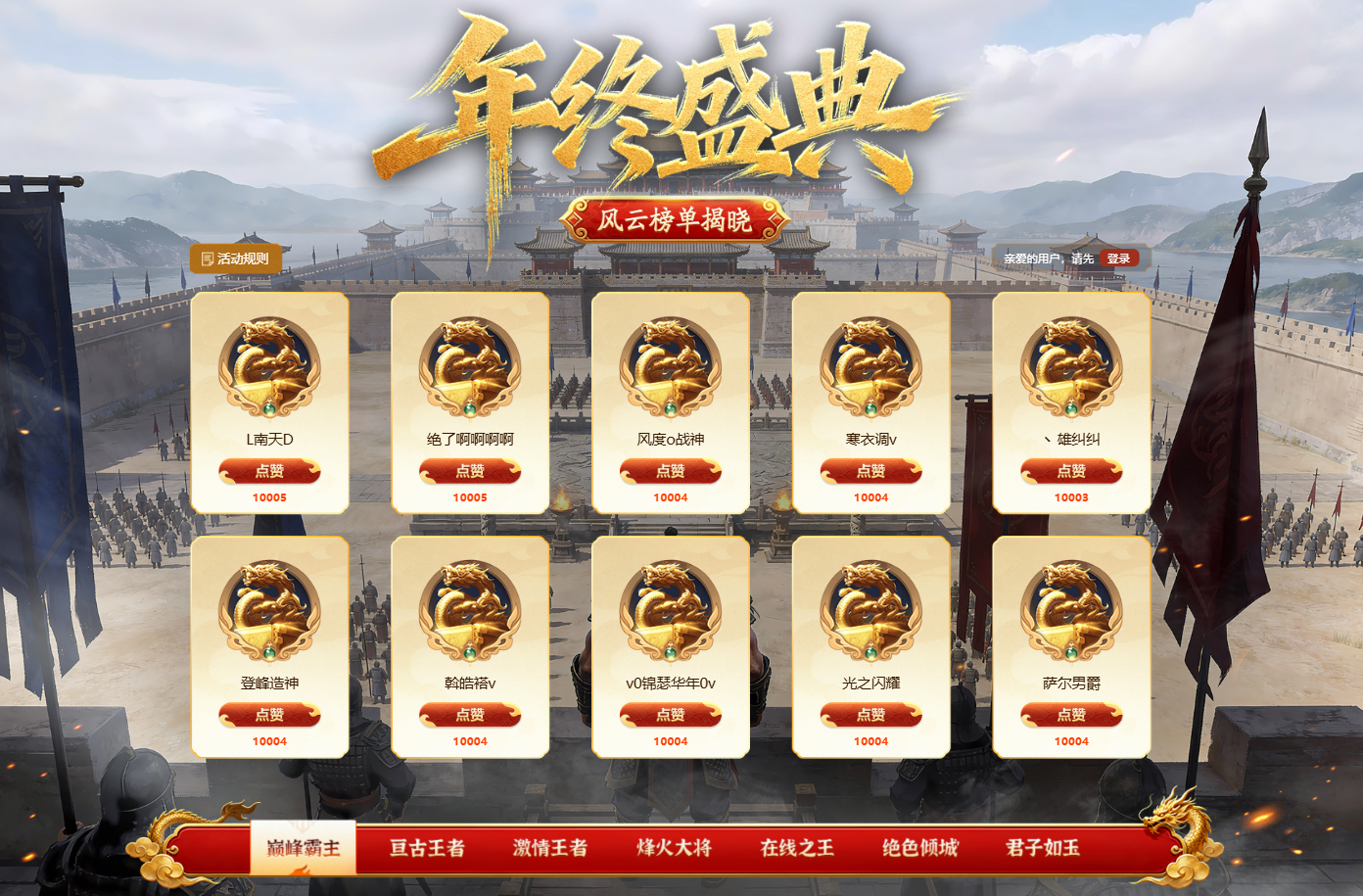 一年一度的征途年终盛典风云榜活动正在进行中,谁将登顶巅峰,谁的故事将被传颂?一同见证荣耀,致敬不凡!