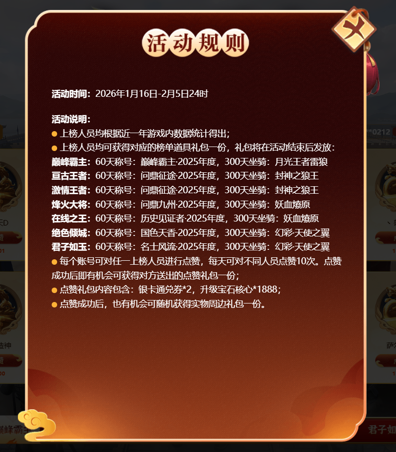 所有荣登风云榜单的玩家,都将获得与榜单荣誉相匹配的专属榜单礼包。内含限定称号、专属坐骑,以嘉奖其过去一年的非凡付出与辉煌战绩。
