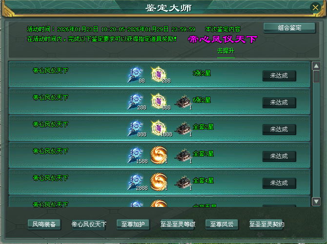 帝心凤仪天下鉴定达成等级,获战备星升级宝石、凤鸣·最终压制减伤【三】等指定道具奖励!