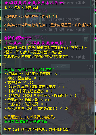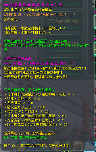 开启闪耀星辰·星座月末小礼包可得闪耀星辰·水瓶座神将卡碎片、神化·星座自选、【非绑】星空神鉴图鉴碎片宝箱等道具!