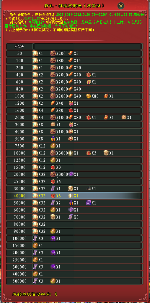 达成1万、3万、7万积分均可得帝心固伤·增幅【三】,10万积分可获“更始·至尊压制神力”buff!