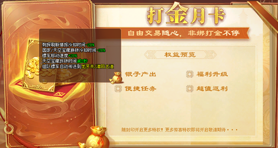 除了上述优点,月卡还能全面提升各项任务完成效率,能够让月卡玩家告别繁琐耗时。例如,在“拉车”这一每日核心任务中,月卡玩家可享受“保底黄车”的福利。“保底黄车”所带来的经验与道具收益都远超普通蓝车。月卡玩家如果在“拉车”任务时担任队长,还能让全队共享加速效果,能够直接传送龙牙/淮阳车夫。这一功能能够大大降低任务过程中被劫风险。此外,月卡权益在天空砖拿砖任务更是优势尽显。只有月卡玩家能搬砖,且不必再卡点卡秒偷砖。“月卡玩家”能够在人少的区服中随时偷砖。最后,月卡还能够缩短刺探/换砖的冷却时间,能够帮助玩家省去大量等待时间。