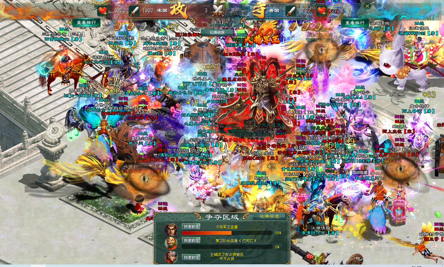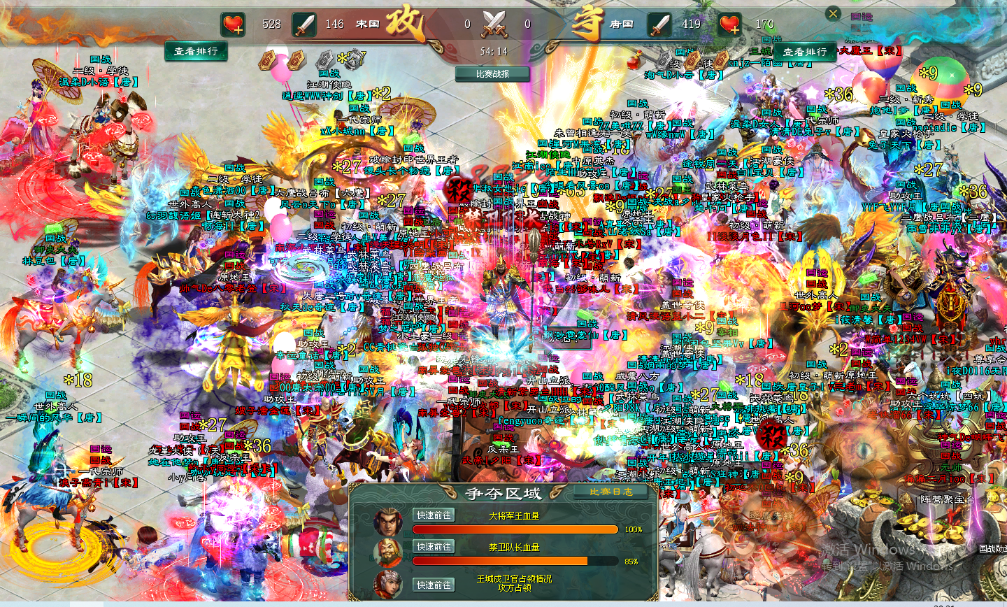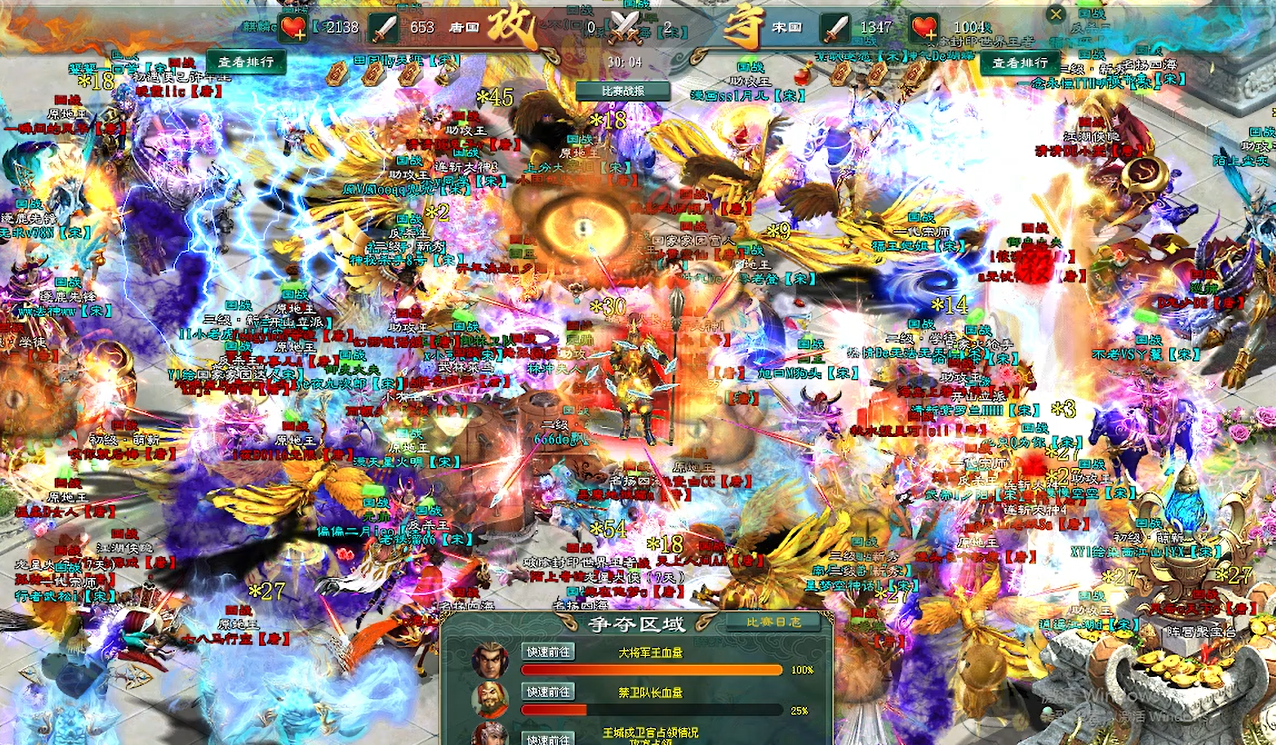 8点15分,唐、宋两国的战役正式打响,在两方拉令官的一个令下, 双方的战士们即刻进入战斗模式,战事一触即发,整个宋国王城血气弥漫,所有法师的大招雷光炼狱和烽火赤壁让这个战场如同炼狱一般,禁卫队长、大将军王、王城戍卫官处这几个掌控着国战命脉的NPC附近挤满了唐国宋国的战士。
