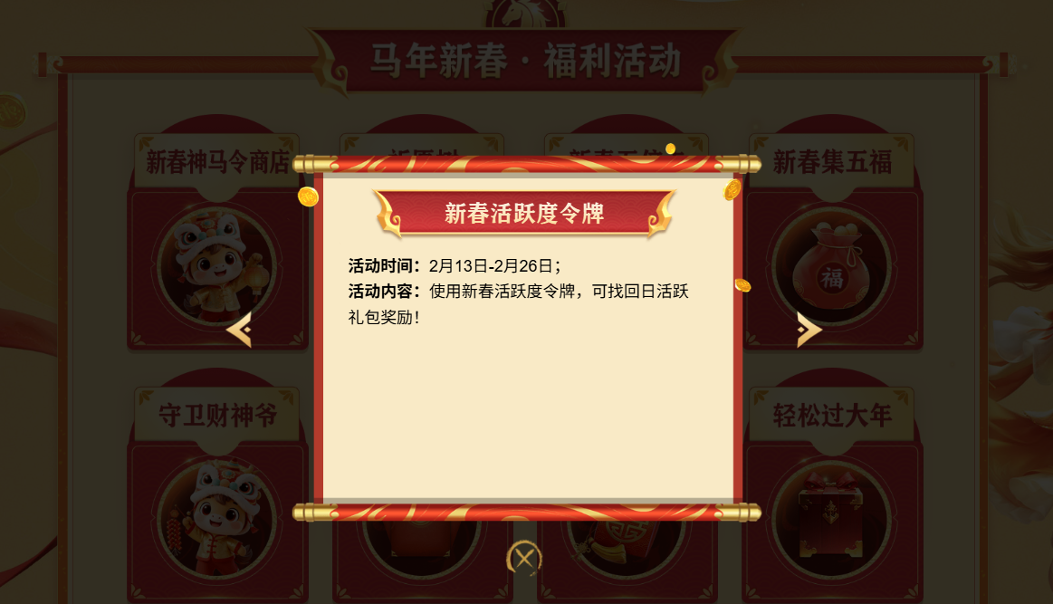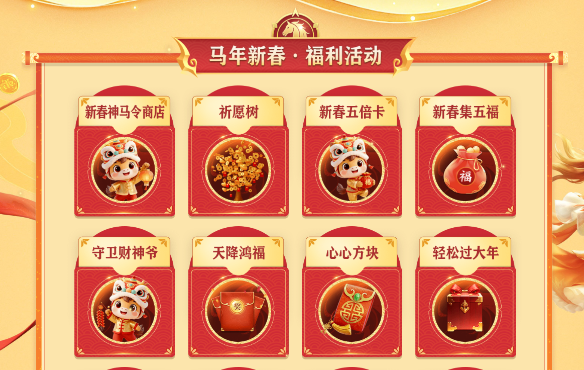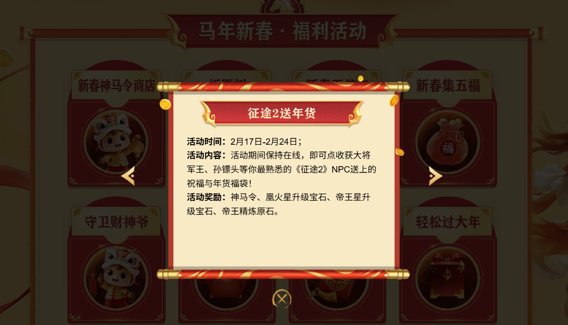 即刻进入马年新春活动专题页,解锁征途新春福利,参与多重狂欢活动,共度热血满满、喜乐安康的新春佳节!