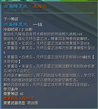 四圣降灵术:被动永久降低自身符术释放时的符纸耐久消耗60%。被动永久强化天师五雷正法,随着四圣神兽技能解锁不同效果:五雷正法减伤效果提升至45%、五雷正法每次伤害递增提升至10%,五雷正法对主目标将100%触发【术符同修】,五雷正法施法期间受到致命伤害后3秒内不会死亡。