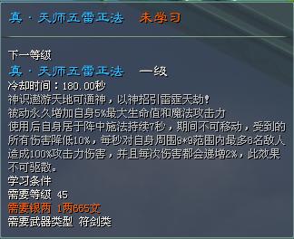 真·天师五雷正法:被动永久增加自身8%最大生命值和魔法攻击力。使用后自身居于阵中施法持续7秒,期间不可移动,受到的所有伤害降低15%,每秒对自身周围9*9范围内最多8名敌人造成100%攻击力伤害,并且每次伤害都会递增5%,此效果不可驱散。