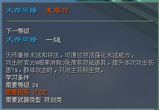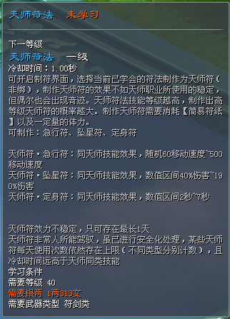 天师符法:可制作非绑天师符纸。天师符法技能等级越高,制作出高等级急行符、坠星符、定身符的概率越大。最高可提供190%伤害、7秒定身、500点移速。