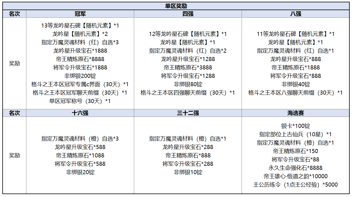 ·单区冠军可获得13等龙吟星石碑【随机元素】、龙吟星【随机元素】、指定万魔灵魂材料(红)自选、200锭非绑银!