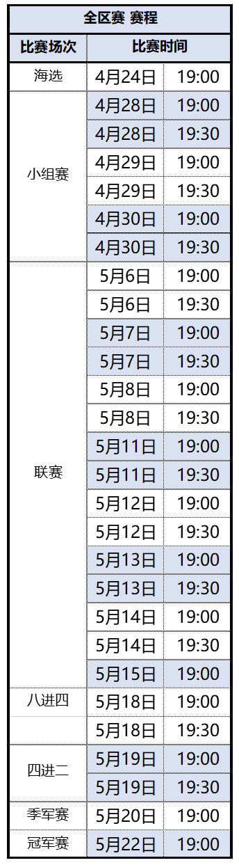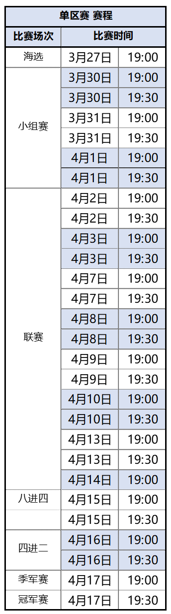 单区、全区赛程如下(风雨同舟区服赛程与其他区服有所不同,以游戏内为准):