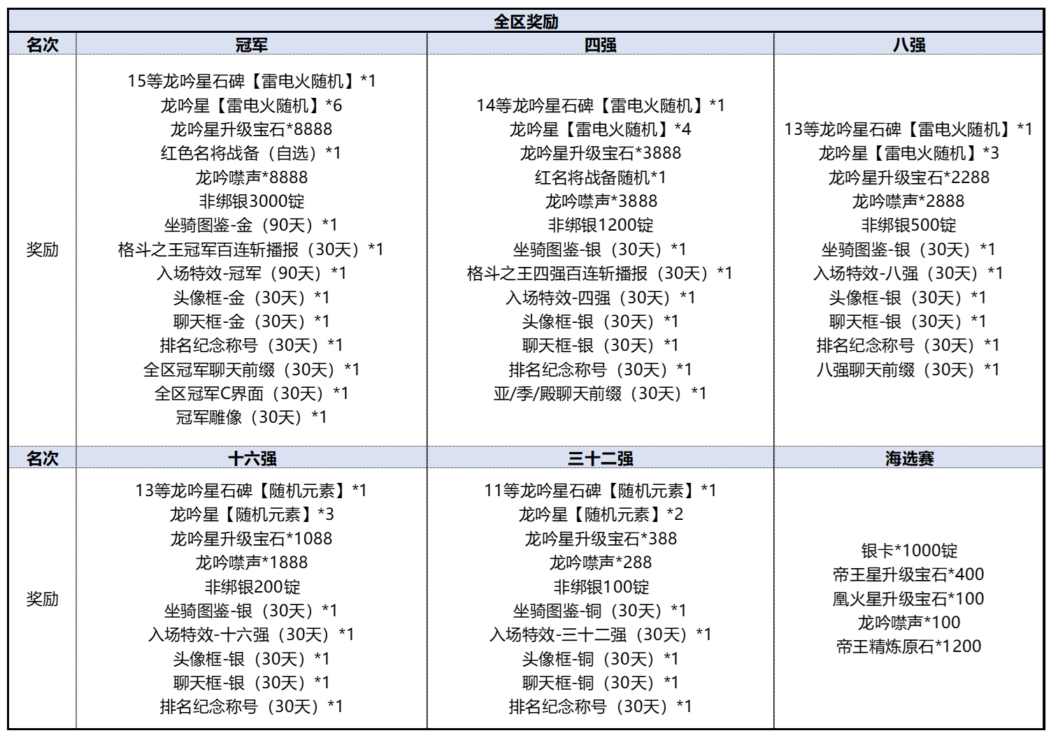 ·全区冠军还将获得15等龙吟星石碑【雷电火随机】、龙吟星【雷电火随机】、大量龙吟星升级宝石、红色名将战备(自选)、3000锭非绑银!