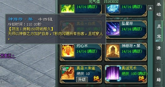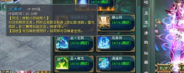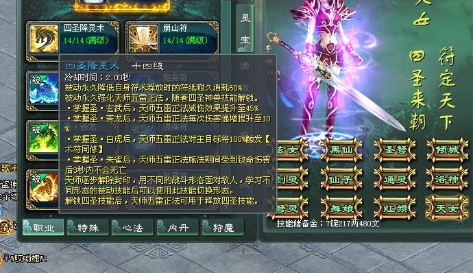 3、四圣降临术:不同的圣兽附体,都会触发天师五雷正法不同的效果,这里举例说一下两个最实用的技能形态:玄武附体减防30%,同时天师五雷正法减伤效果提升至45%;白虎附体增伤30%,同时天师五雷正法100%触发术符同修,相当于提升伤害20%,非常的恐怖,所以非常推荐打架时白虎附体。