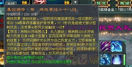 4、回溯符:迎来大改动,使用加血的回溯符时刷新天师五雷正法和定身符的冷却时间,非常逆天,相当于赋予了新天师三个群伤(两次五雷正法和坠星符)和两次强控的特权,直接让天师的输出能力拉满。
