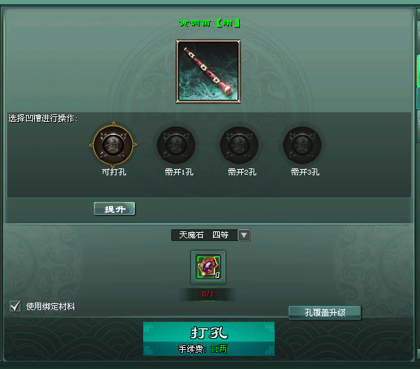 打孔操作:使用天魔石为装备打孔,每件装备最多可打4个孔,天魔石分为5等(白、蓝、黄、绿、紫),等级越高,打出的孔等级越高,可镶嵌的魂魄石等级也越高;已打孔的装备可使用更高等级的天魔石覆盖原有孔洞。