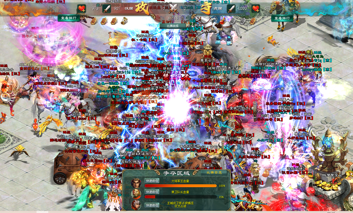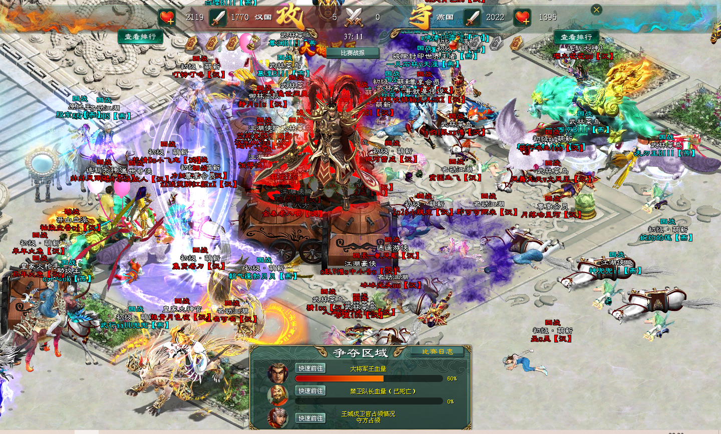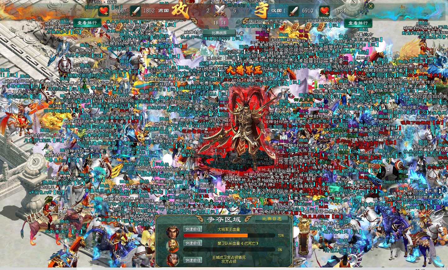 看得出这段时间的沉寂,各位战士都憋着一股劲,在这场国战中完全释放开来,禁卫队长处双方战士人满为患,禁卫队长的血量迅速下降。