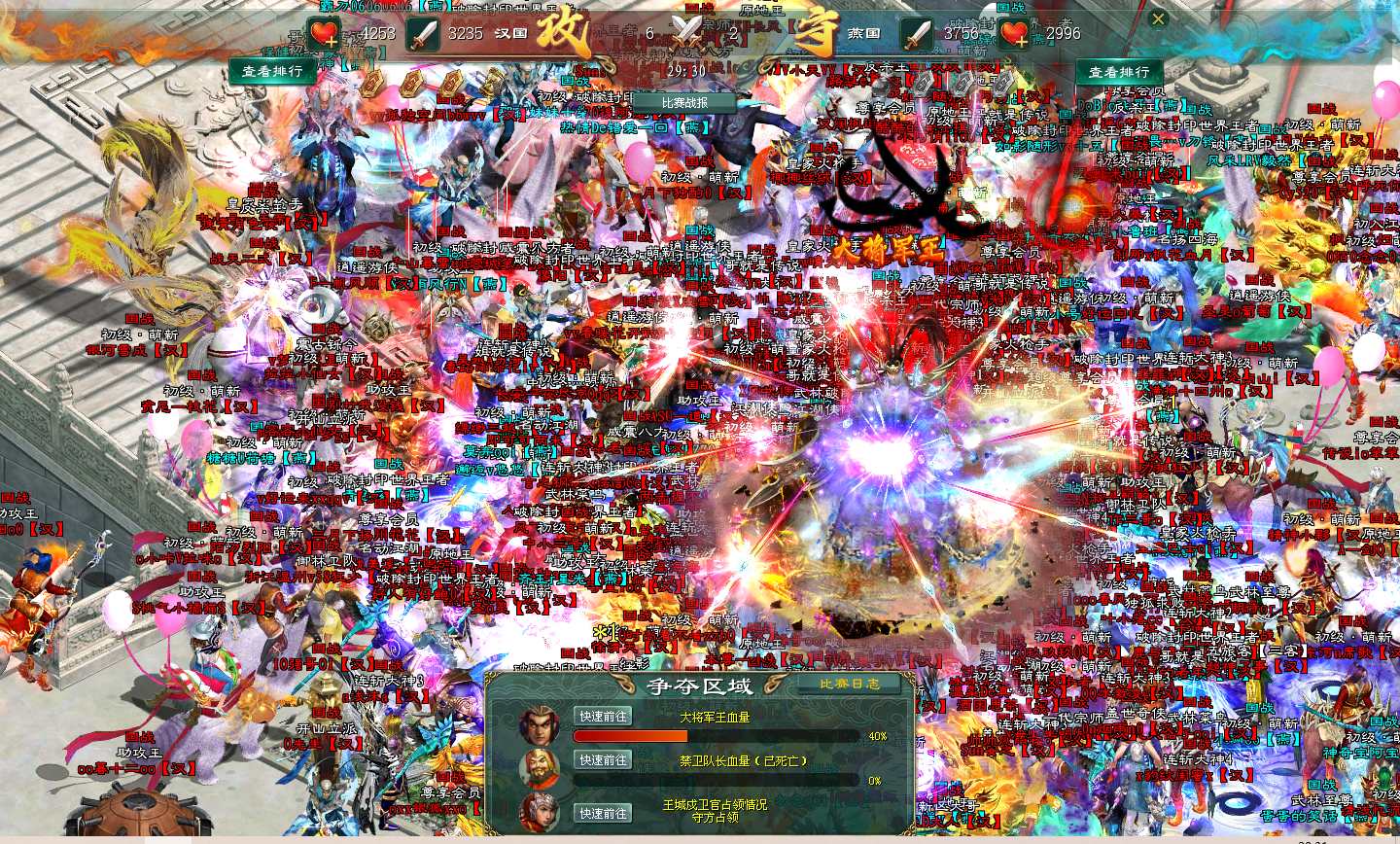 所有汉国的战士们随着第一波站稳王城戍卫官的先发部队的示意下,全部接令直奔禁卫队长,基本汉国战士的第一个大招全部都贡献给了燕国禁卫队长。燕国禁卫队长哪经得住几百个战士同时释放的大招啊,当时就掉了百分之二十的血量。