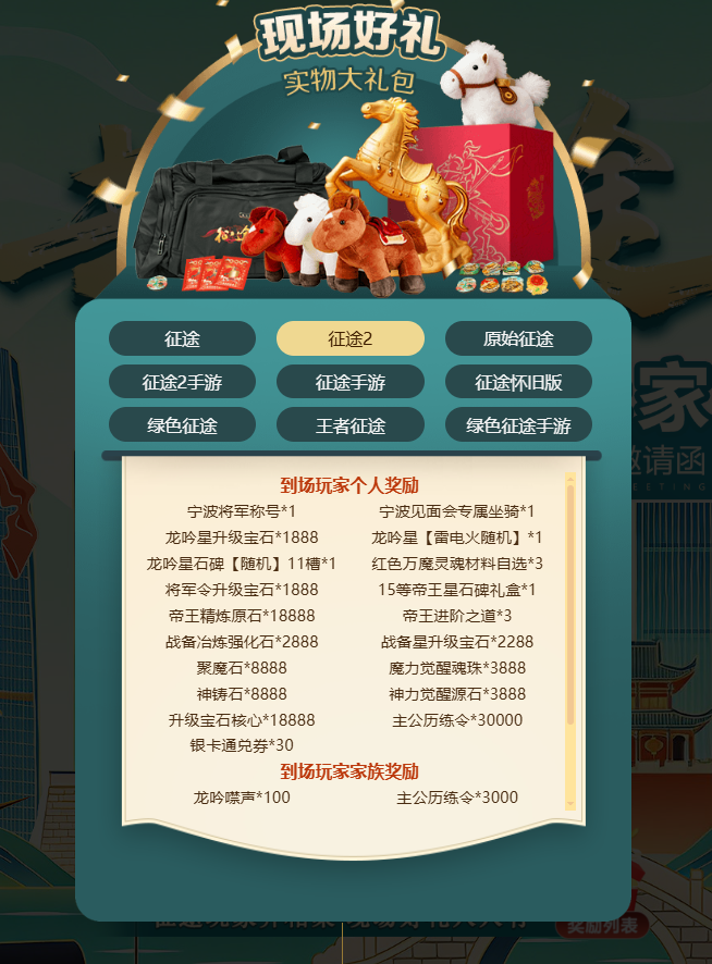 1、臻享实物周边:到场玩家可领取征途旅行包、征途战马挂饰、金马摆件等精美伴手礼,将聚会记忆带回家珍藏。