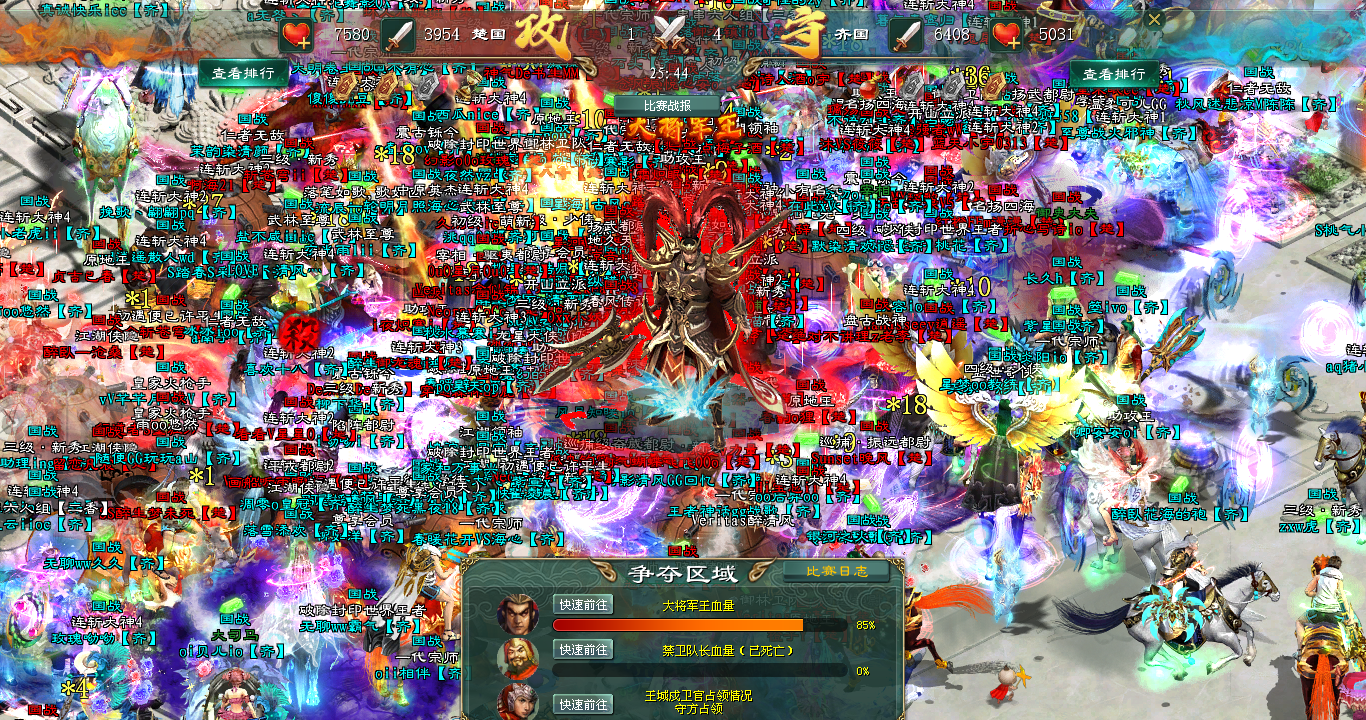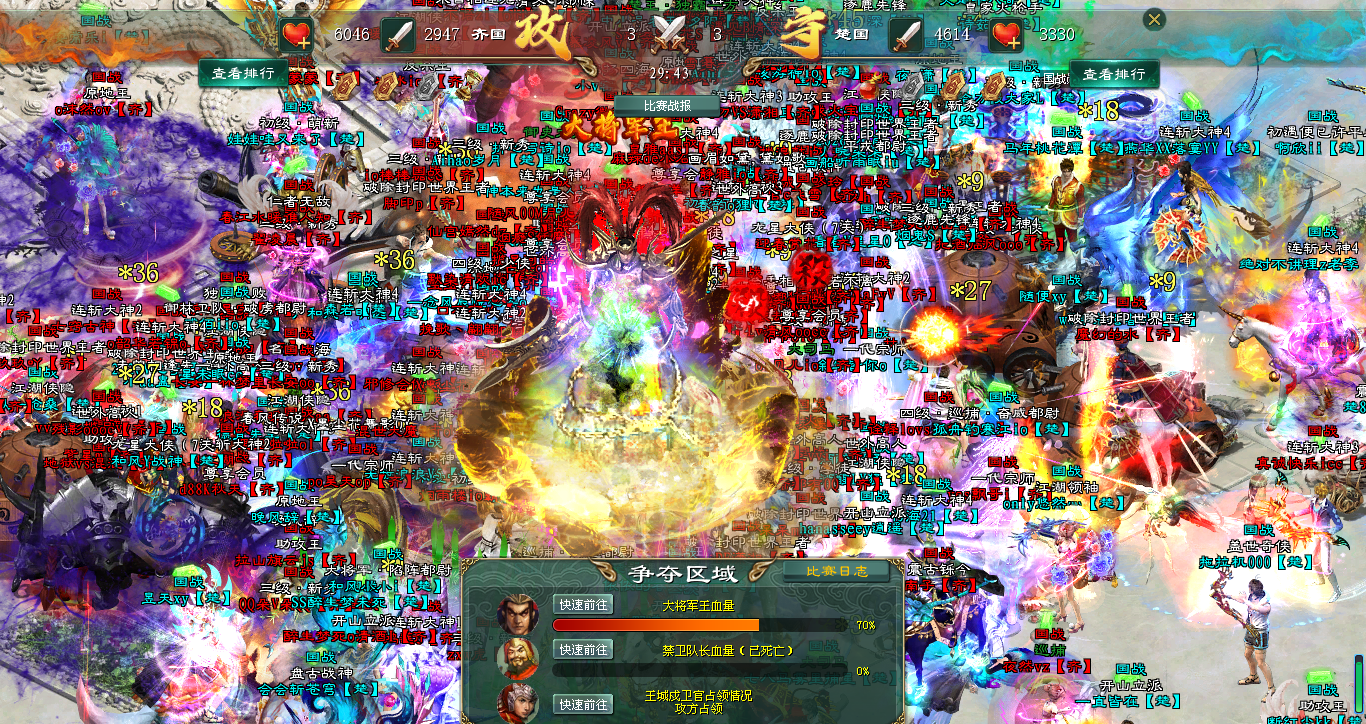 即使楚国的攻势迅猛如虎,齐国仍然死守不退,家族令、国王令接连拉出,层层防御将大将团团围住 。楚国拼尽火力,但每一次冲锋都收效甚微,他们不断的原地,原地复活次数已经突破了万次,鲜血染红了大地。 国战进入倒计时,大将仅剩30%血量,楚国果断选择加时再战。两分钟后,齐国给大将加血并起帮主令,大将周围再度被重兵封锁,楚国进攻愈发艰难。