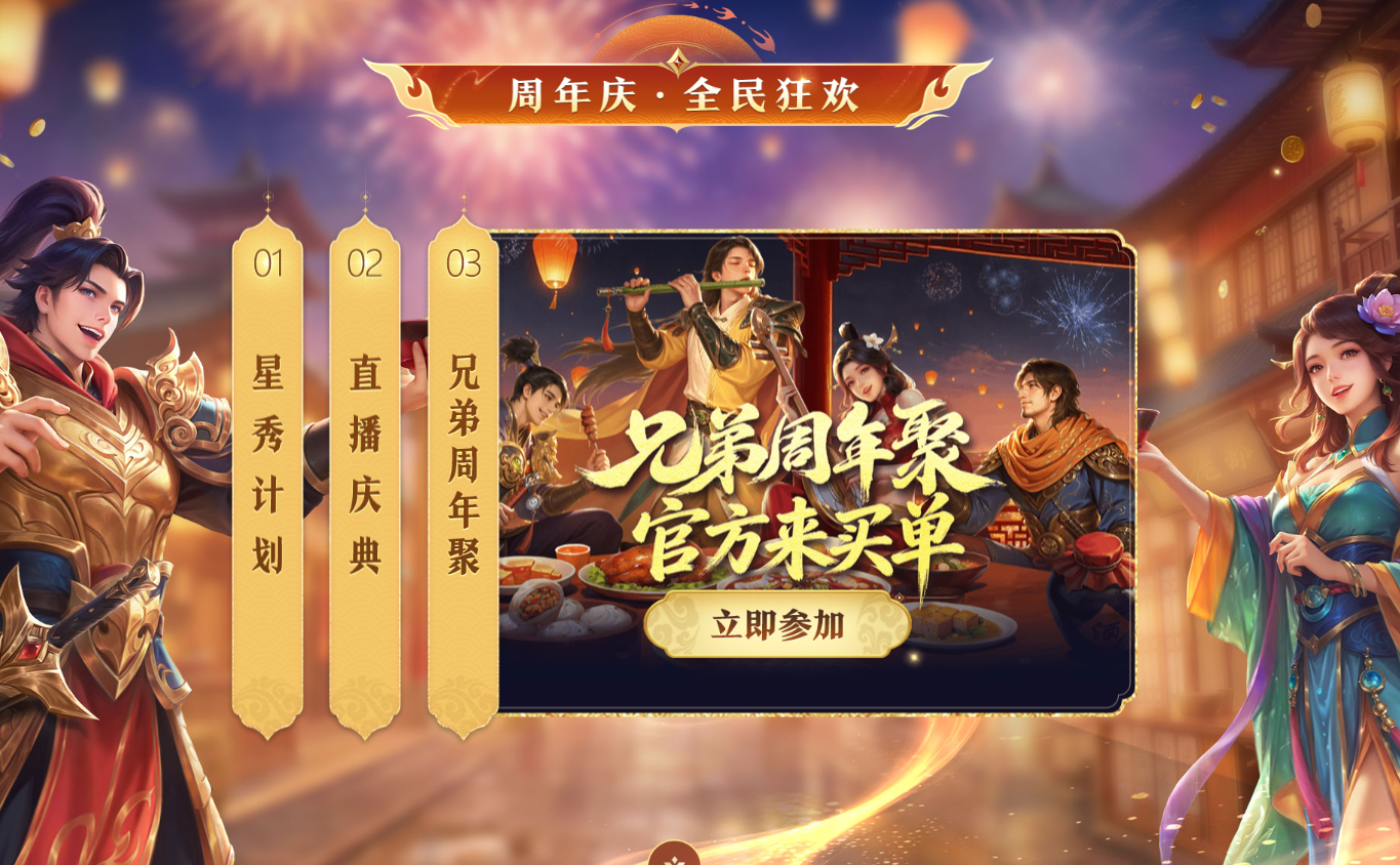 参与兄弟周年聚,线下聚会官方买单。4月24日-26日看直播领好礼,直播间实物周边放送不停。邀请热爱分享的你加入周年庆星秀计划,视频创作者火热招募中!