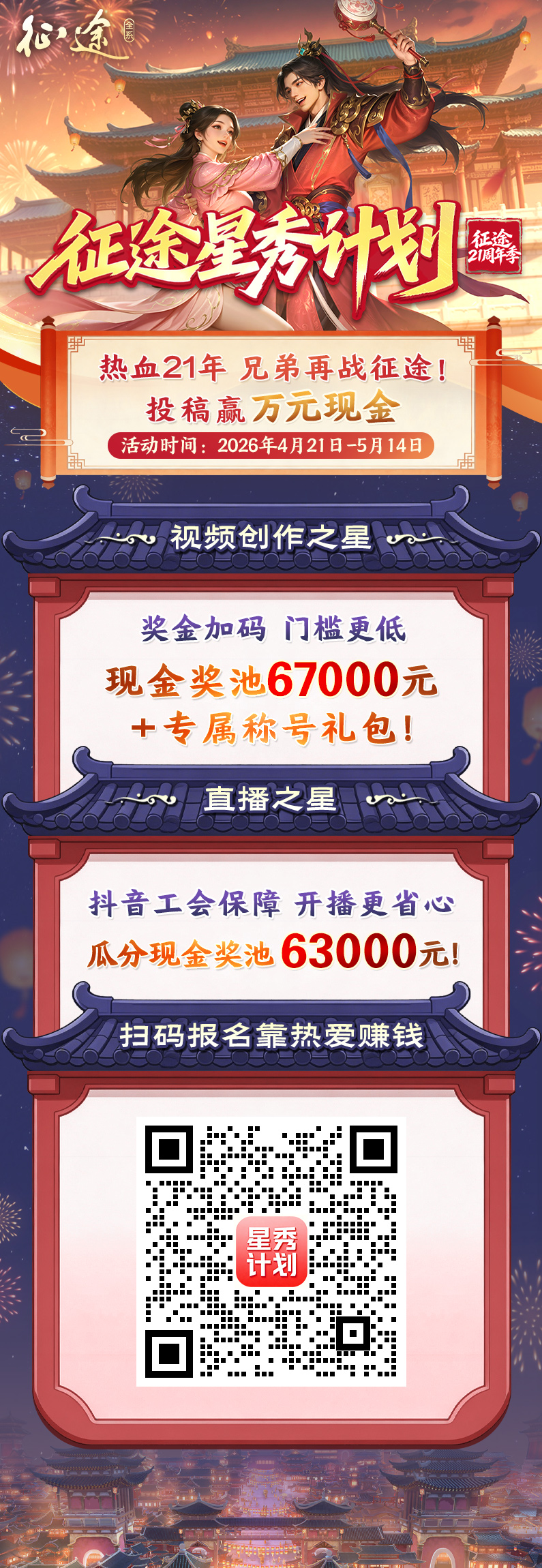 4月21日-5月14日,征途IP公测21周年庆“征途星秀计划”邀请热爱创作、热爱分享的你,讲征途故事,赢万元现金。
