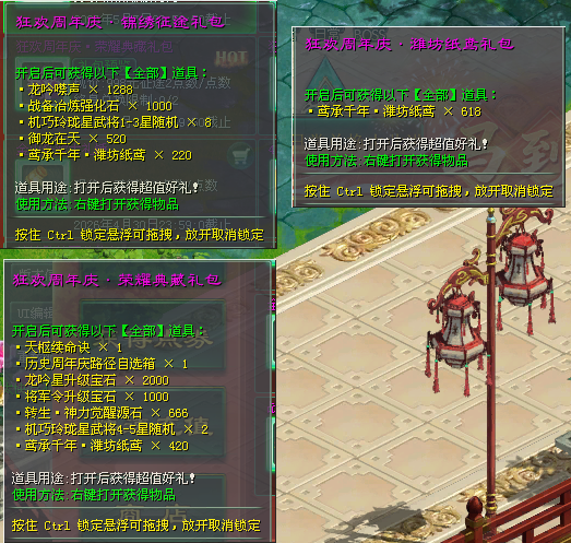 开启狂欢周年庆·锦绣征途礼包、狂欢周年庆·荣耀典藏礼包、狂欢周年庆·潍坊纸鸢礼包,均可获得鸢承千年·潍坊纸鸢,更有龙吟噤声、天枢续命诀、龙吟星升级宝石、将军令升级宝石等各种实用道具等你拿!