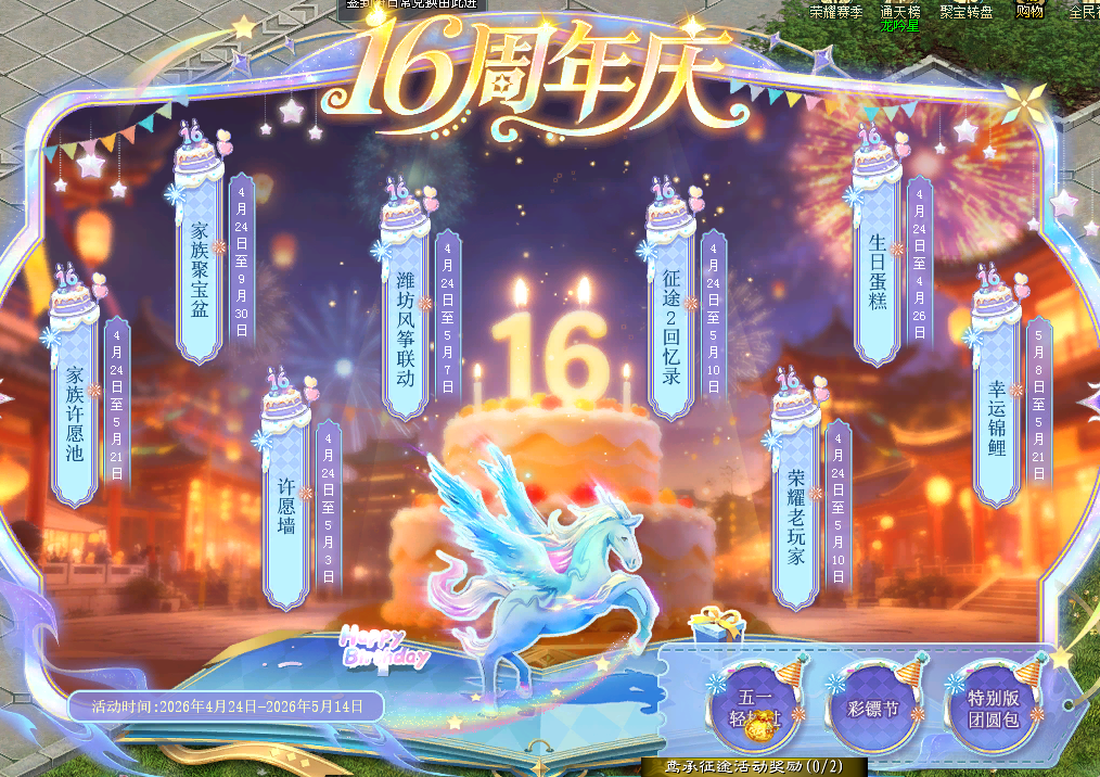 一、征途2十六周年庆典火热开启!许愿墙、回忆录、生日蛋糕等周年活动同步上线,相约好友战疆场,感受周年狂欢的热闹氛围~家族&个人聚宝盆再开启,奖励重磅加码!鸢承征途·潍坊风筝联动活动上线,收集材料,兑换免费定制联动风筝配饰和丰厚好礼!