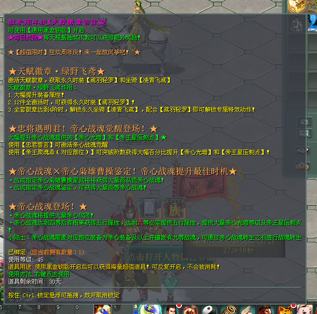 三、狂欢周年庆·天赋徽章百宝盒来袭!激活天赋徽章,获取永久时装和坐骑!帝心战魂,能够提供大量帝心攻防!龙吟星黑盒开启,多种好礼等你来拿!开启狂欢周年庆系列礼包均可获得鸢承千年·潍坊纸鸢和各种实用道具!战神助战礼包助力战力狂飙!