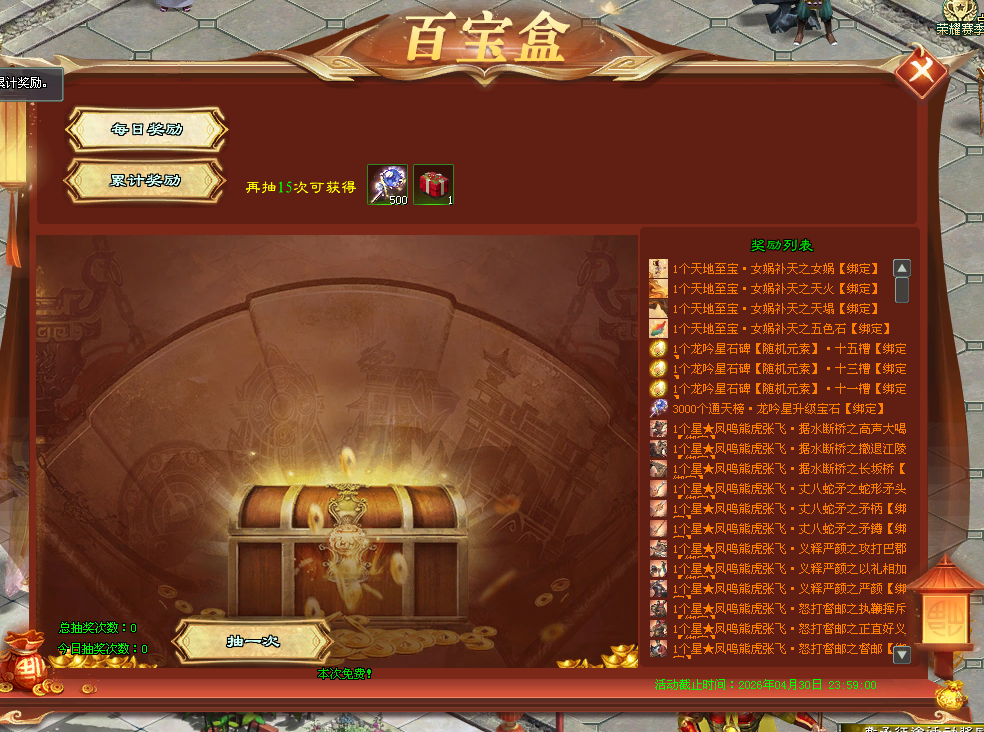 龙吟星百宝盒开启,有机会获得天地至宝·女娲补天之女娲、龙吟星石碑【随机元素】·十五槽、凤鸣熊虎张飞·丈八蛇矛之蛇形矛头等强力道具!