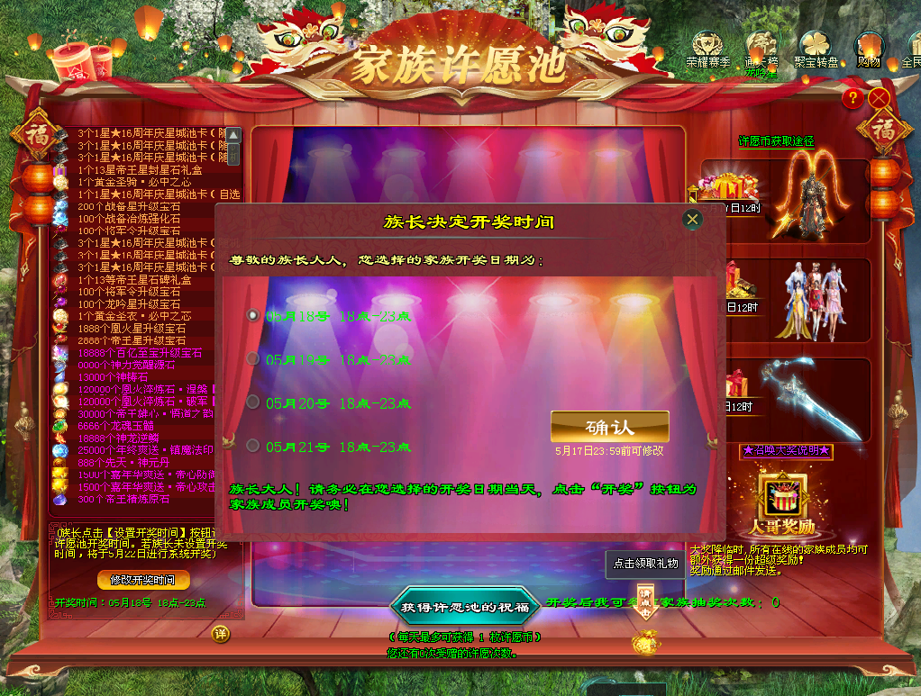 16周年庆星城池卡、13等帝王星石碑等你许下心愿。族长可设置开奖时间召唤大奖降临,若未设置系统将于5月22日自动开奖,惊喜不错过!