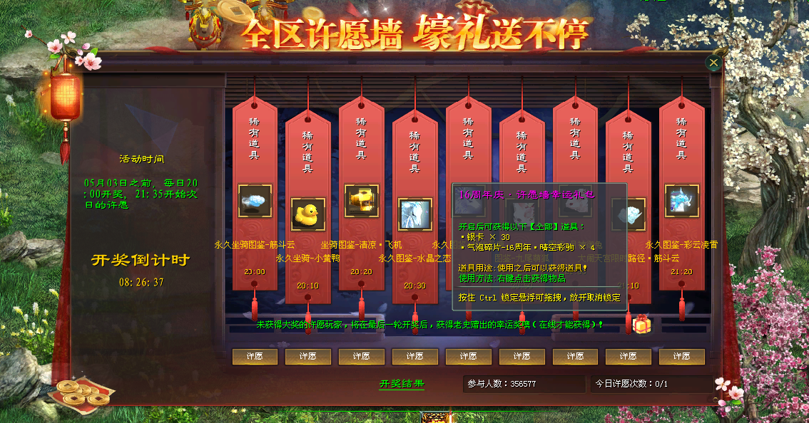 前往周年许愿墙许下心愿,不仅有概率成为“天选之子”赢取当天超级大奖,未中奖的玩家也不会空手而归,将在最后一轮开奖时获得幸运礼包!内含银卡和十六周年庆限定气泡图鉴碎片!