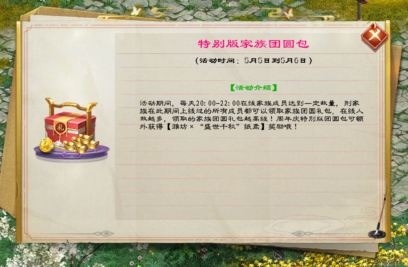 特别提醒:在5月5日-5月6日上线,领取特别版家族团圆包,还可获得额外的“盛世春秋纸鸢”,快人一步换得心仪好物!