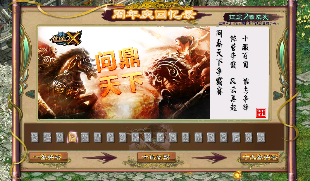 每天点击“回忆夹”,收集“回忆卡”点亮周年回忆录册,集齐10张回忆卡后,即可获得十六周年庆限定头像,记录你与征途的共同记忆。