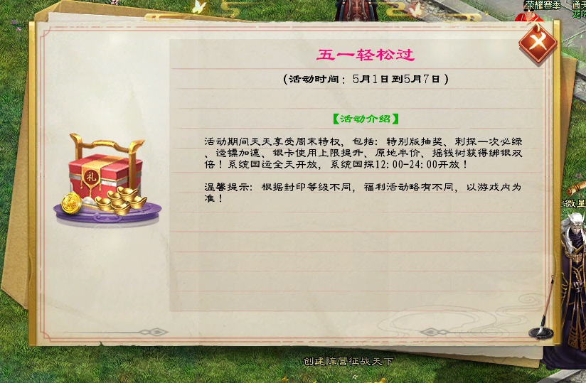 整个假期,每日享周末特权大礼包:刺探一次必绿、运镖加速、银卡使用上限提升、原地复活费用半价、摇钱树获得绑银双倍;系统国运全天开放,系统国探12:00-24:00开放,时间更自由,任务更轻松!