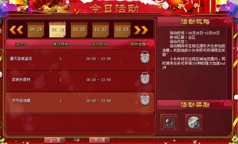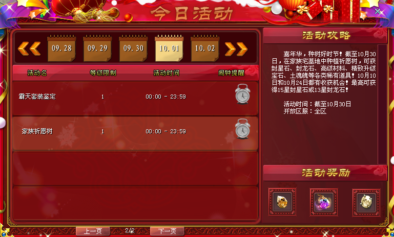 活动说明:活动当天晚上20:00-22:00期间,家族成员在线达到一定数量即可在22:00邮件获得相应的家族团圆礼包。在线人数越多礼包奖励越丰厚,千万不要错过!