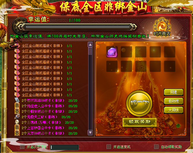 参与非绑金山有机会获得非绑全区金山随机福袋!每参与1次金山可累积1点幸运值,提升橙色大奖几率,如累积满500次未获得,可直接进入时光商店,如500幸运值内获得橙色大奖则幸运值清空,保底金山,保你中大奖!